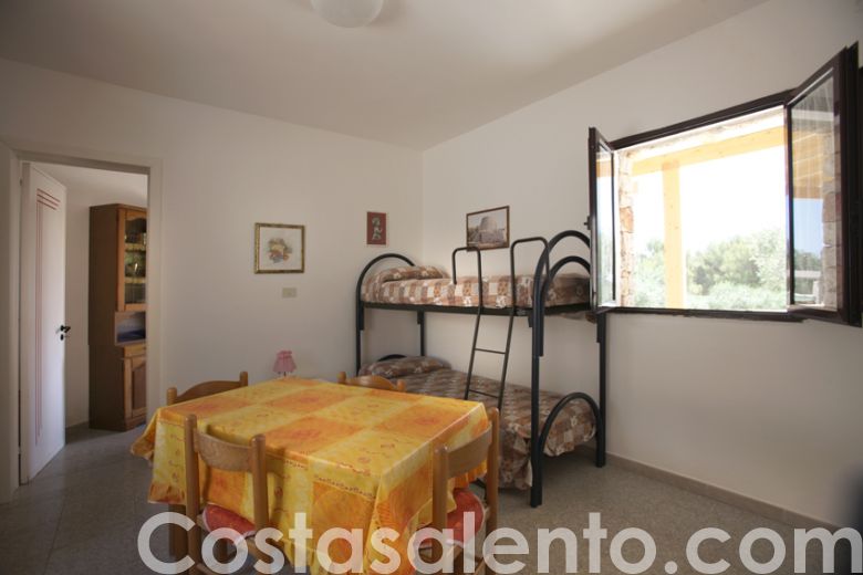 E’ in tale contesto che si staglia a pochi mt. dal cristallino mare di Novaglie, un complesso di tre trulli con piscina in comune immersi in un'oasi di pura tranquillità. L'intero complesso è immerso in 2000 mq di giardino ben curato con piscina in comune e solarium attrezzato per godere delle calde giornate d'estate sotto l'ombra dopo un refrigerante tuffo in piscina accerchiata da un verde prato inglese su cui sdraiarsi per una tintarella. Uno dei tre trulli è“Stella marina”. Trullo dal caratteristico rivestimento in pietra, così denominato per rendere omaggio a questo magnifico echinoderma che abbellisce il nostro mare.L’ appartamento si compone di un soggiorno con angolo cottura, una camera matrimoniale,una camera con letto a castello e due bagni Nella parte antistante con affaccio sulla piscina, uno spazio esterno di pertinenza consente agli ospiti di ammirare il mare e consumare i propri pasti all'aperto, altresì arredato di salotto in vimini e coperto da tettoia in legno