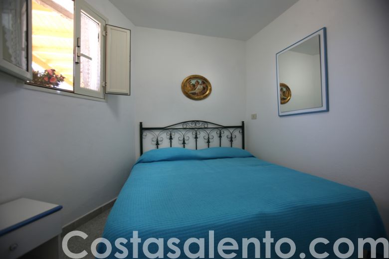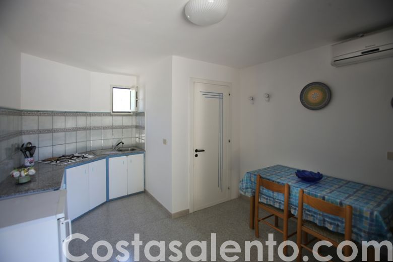 Si tratta di un bilocale che ospita un accogliente soggiorno con angolo cottura, una camera matrimoniale e un bagno. Nella parte antistante con affaccio sulla piscina, uno spazio esterno di pertinenza consente agli ospiti di ammirare il mare e consumare i propri pasti all'aperto, altresì arredato di salotto in vimini e coperto da tettoia in legno