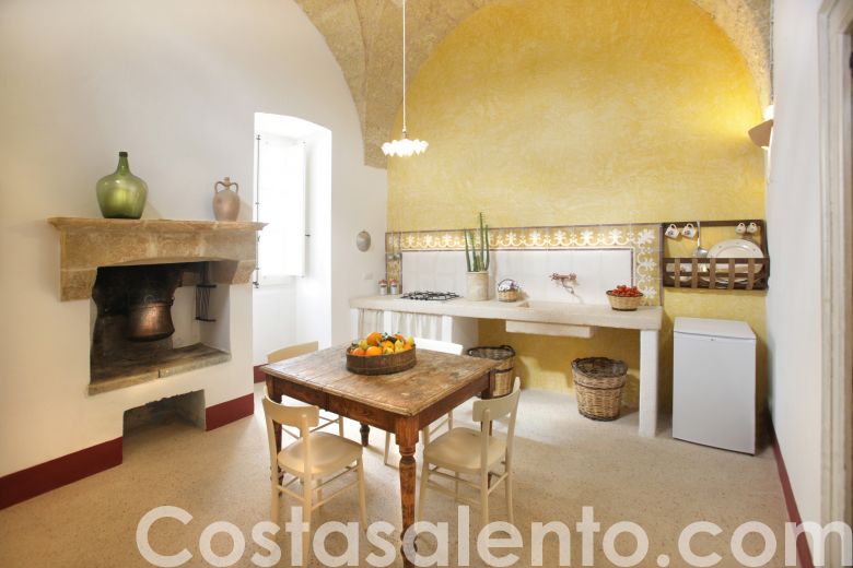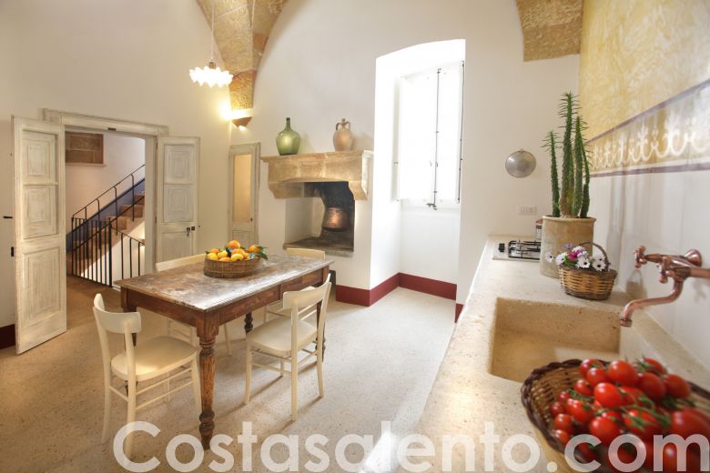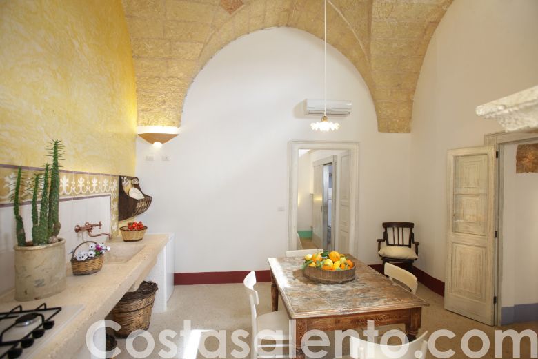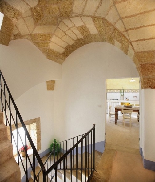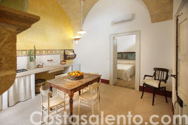 Nella struttura si accede da un portale ad arco con chiave di volta che incornicia un antico portone. Già da qui si percepisce quella che è l'atmosfera interna: pezzi di intonaco originale lasciati scoperti sulle pareti come affreshi, i gradini della scala evidentemente usurati dagli anni sono stati solo spianati, anfore e capasuni riempiono spazi vuoti, volte a stella faccia vista ed un' inventiva nell'arredamento appositamente selezionato made in Salento.
