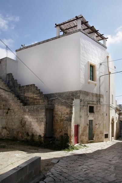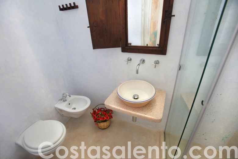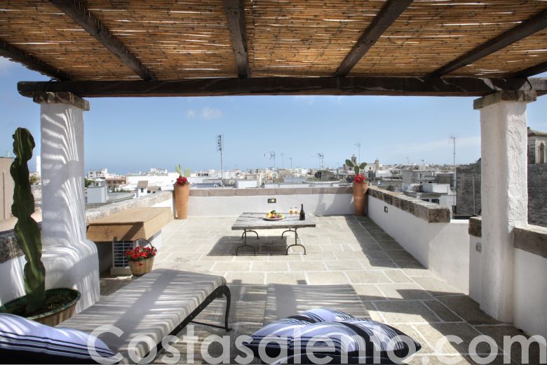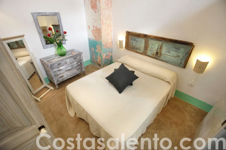 Alla fine di una prima rampa di scale troviamo la sala da pranzo con angolo cottura in muratura e camino antico, impossibile non notare il gioco di colori e luci che rendono l'ambiente particolarmente suggestivo, una porta divide la romantica camera da letto matrimoniale i complementi d'arredo utilizzati sono pezzi recuperati e restaurati da artigiani esperti, ed anche il design del bagno ha tutto un suo perchè a partire dallo specchio ricavato da un'antica finestra. Mediante un'altra rampa di scale si giunge sul terrazzo arredato ed illuminato con vista sulla piazza del paese da dove ammirare il mare nelle giornate estive più limpide. Anche qui i materiali per l'arredo non sono stati scelti a caso.