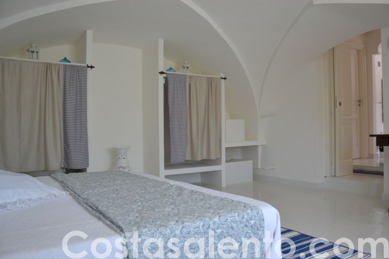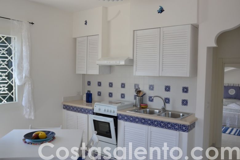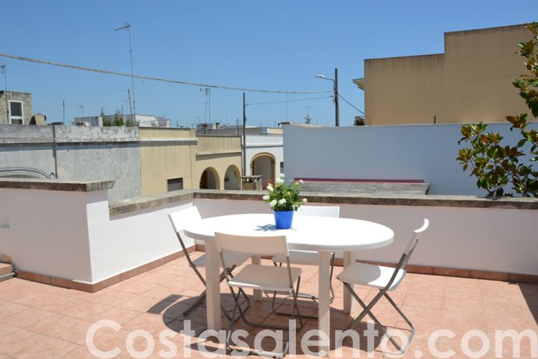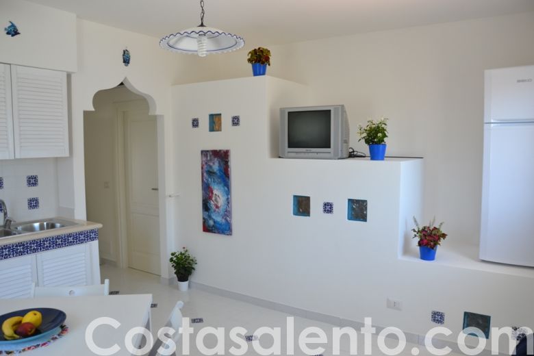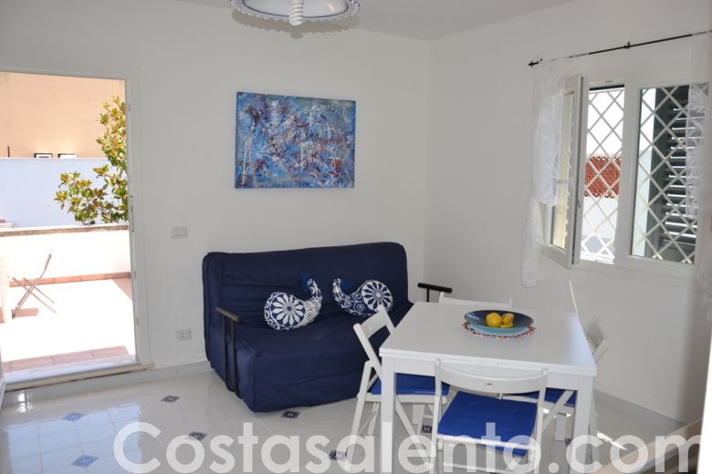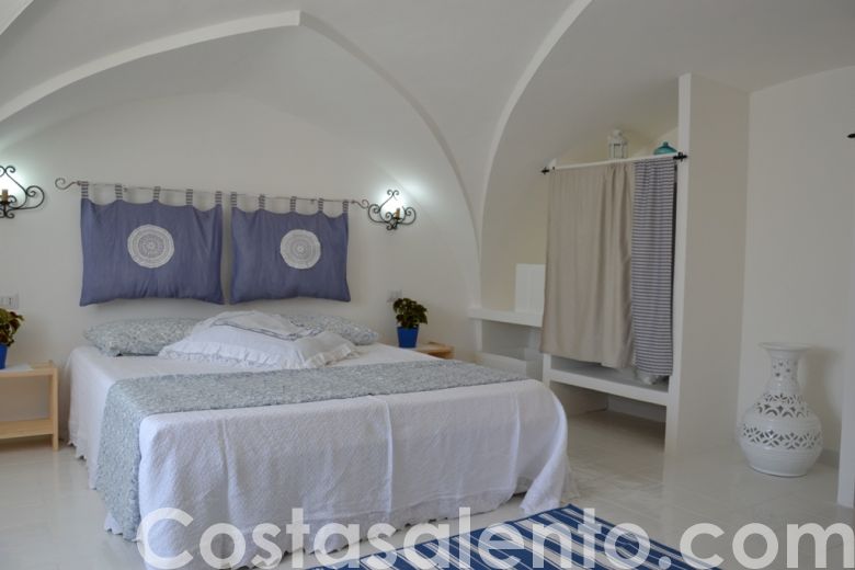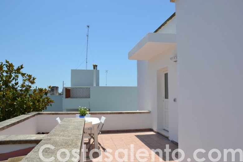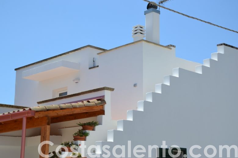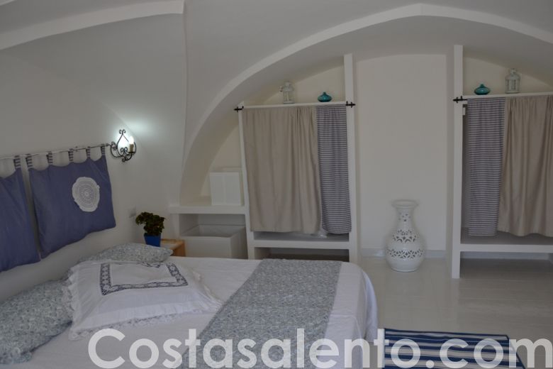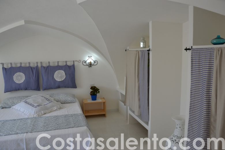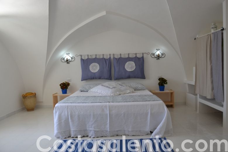 Mida Salento è un appartamento, minuziosamente ristrutturato ed appena terminato, al piano primo di un’antica dimora sita in uno dei più bei borghi del Salento: Patù, paese ricco di storia e cultura, con le sue antichissime chiese, il bellissimo Palazzo Romano, l’affascinante “Cento Pietre” ed un centro storico colmo di vecchie dimore. A circa 2 km, dista l’incantevole marina di S. Gregorio affacciata sul limpido mare Jonio, dalla quale, in pochi minuti si raggiungono le dorate spiagge sabbiose di Pescoluse, le famose “Maldive del Salento” o l’ultimo paese del tacco d’Italia: S. Maria di Leuca. La struttura, arredata con cura e gusto nel classico stile mediterraneo, tutto nei colori tenui del bianco e del blu, si compone di un’ampia camera da letto matrimoniale con volta a stella, dotata di armadio a giorno e poltrona-letto (singolo), un soggiorno-pranzo dotato di divano-letto (matrimoniale), angolo cottura , contraddistinto dalle bellissime maioliche tunisine dipinte a mano, un piccolo disimpegno ed un bagno. Dal soggiorno si accede su un ampio terrazzo a piano per cenare e rilassarsi nelle quiete serate d’estate. L’appartamento è dotato di ogni tipo di comfort per soddisfare i suoi clienti: aria climatizzata, tv, lavatrice, ferro da stiro, stoviglie varie e su richiesta, biancheria da bagno e da letto. Nelle immediate vicinanze, da raggiungere anche a piedi, pizzerie, ristoranti, supermercati, farmacia ecc